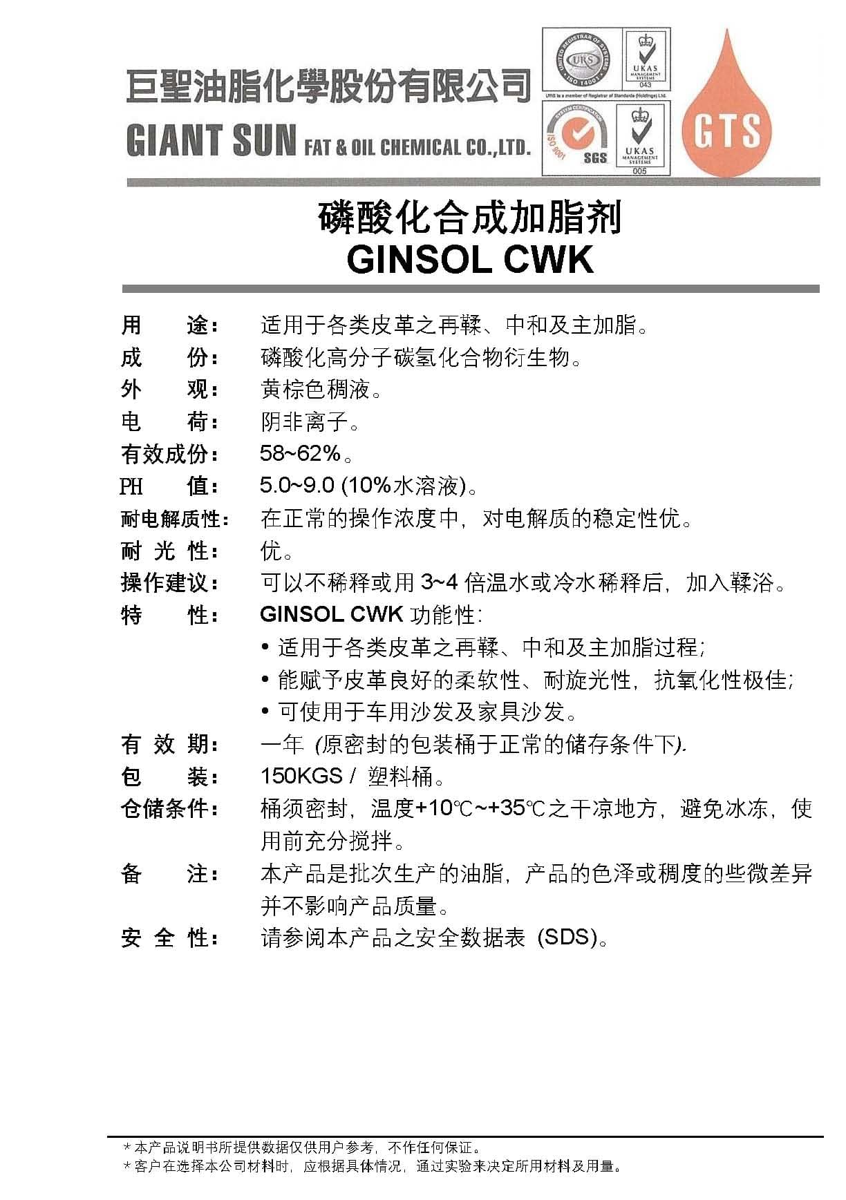 - 能赋予皮革良好的柔软性、耐光性,抗氧化性极佳。