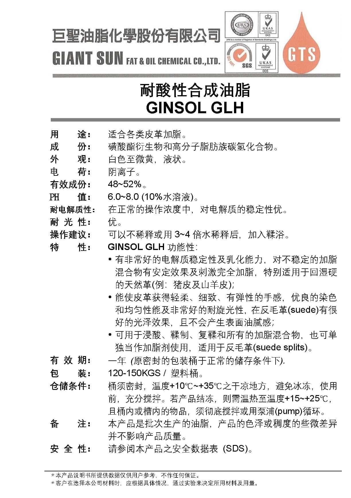 - 有非常好的电解质稳定性及乳化能力,对不稳定的加脂混合物有安定效果及刺激完全加脂,特别适用于回湿硬的天然革(例:猪皮及山羊皮)。